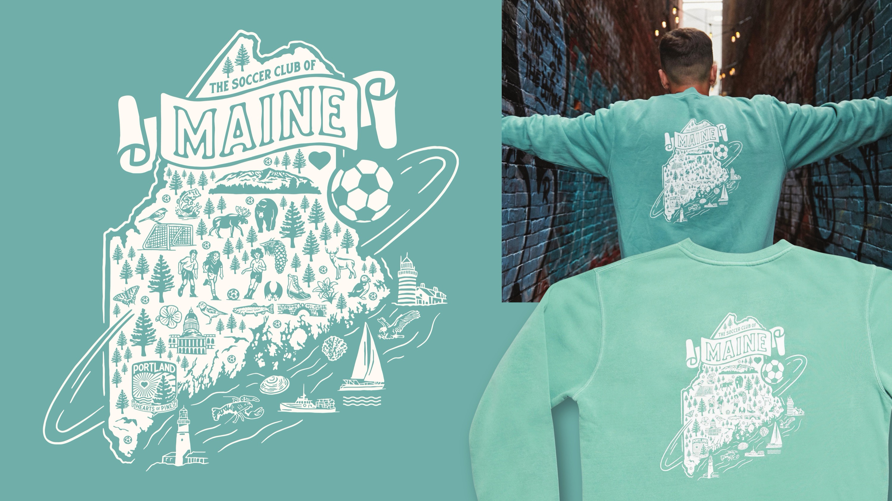 The Portland Hearts of Pine begin their inaugural season in May, and despite not yet playing a game, have introduced themselves as a community-driven soccer club for all of Maine to support. I was tasked with designing multiple items for the team's first merch drop, targeting the entire state's soccer community, from the kids playing the game, to parents and coaches across Maine. The Hearts' aim is to have their branded merchandise feel like a lifestyle brand that soccer fans and non-soccer fans alike can enjoy and wear with pride for the state of Maine. My illustrations include a 'Support Maine Soccer' badge that was used on t-shirts, stickers and magnets, a map of the state of Maine announcing the Hearts as 'The Soccer Club of Maine' and showcasing all the places, animals, and objects that make up this state, and a take on Maine's iconic Moxie soda label.